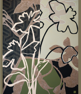 1 800,00 €L 120 x H 150 x 2cm Géométrie de l'arbre et du papillon, peinture sur toile de lin.